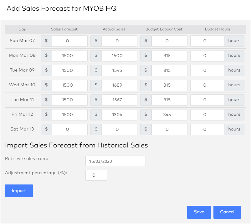 Sales Forecast, Actual Sales, Budget Labour Cost and Budget Hours data can be manually added through the Roster page: