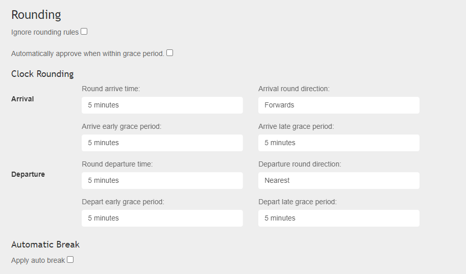 You can select a rounding rule for Round departure time, Depart early grace period and Depart late grace period by: 0 min, 1 min, 5 mins, 8 mins, 10 mins, 15 mins and 30 mins.