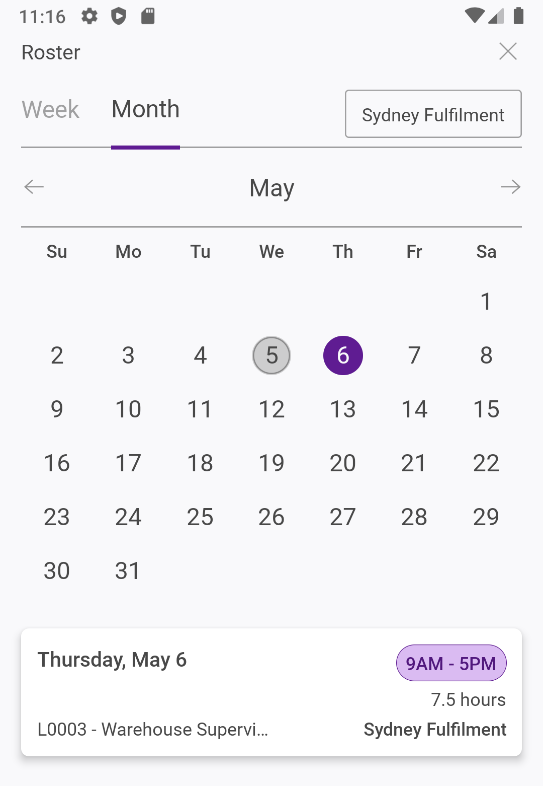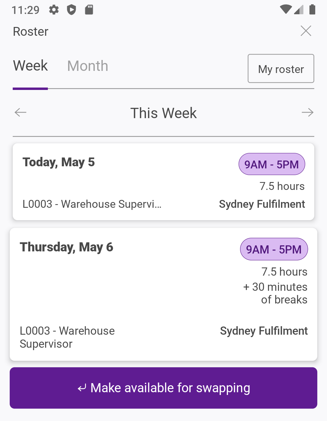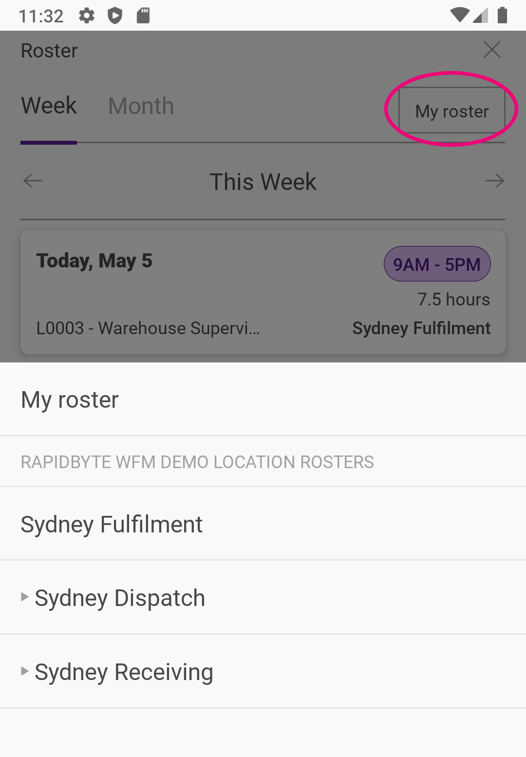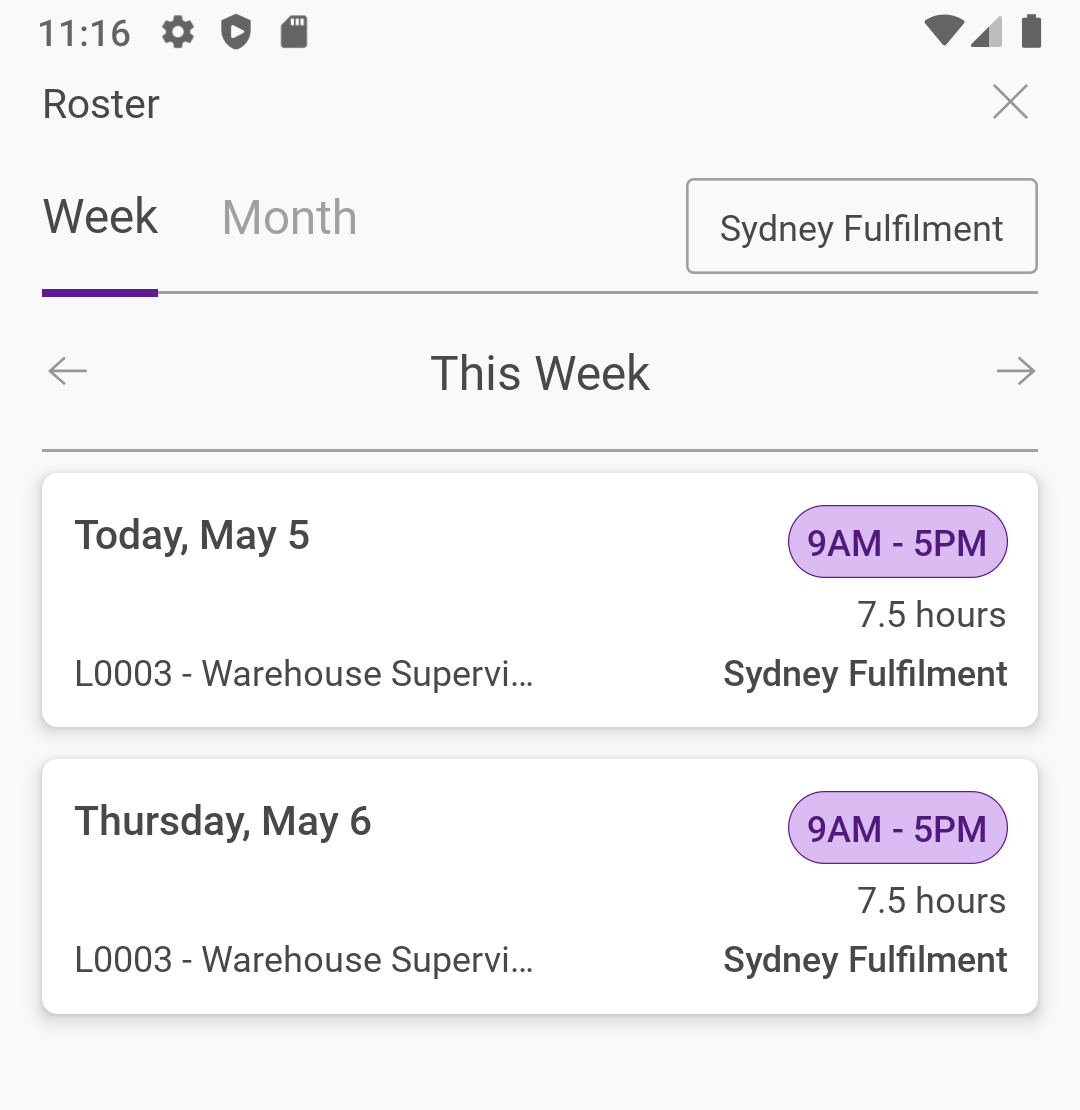 You are redirected to the Roster screen. Select the Week or Month tab to choose how to view your shifts.