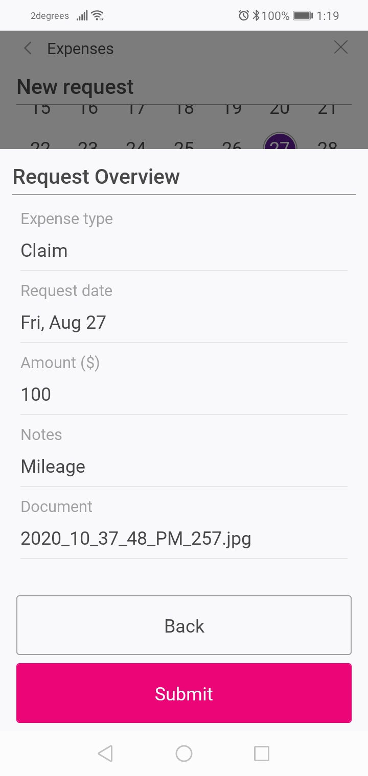 The new expense appears on the Expenses screen. Tap the request to see more detail.