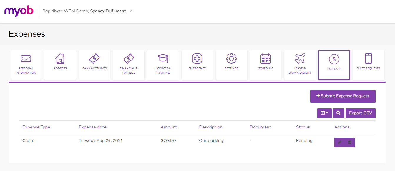 You can claim your work-related expenses in MYOB Acumatica — Workforce Management using the My Profile section of the web app, or in the MYOB Advanced Teams mobile app. Once you've submitted your claims, they'll go to your manager for approval, and then to payroll to be paid.