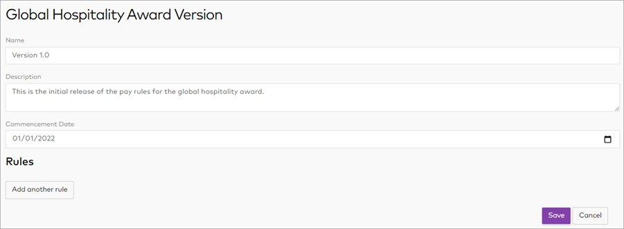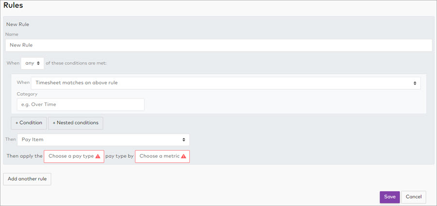 To add conditions to the pay rule version, click Add another rule, then click New Rule.