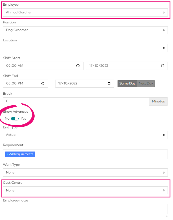 To update the shift's Cost Centre, Work Type, and other more specific settings, select Show Advanced.