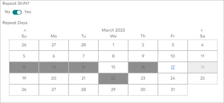 To create a series of repeated shift, select Yes for Repeat shift? then select the days to repeat the shift from the calendar view.