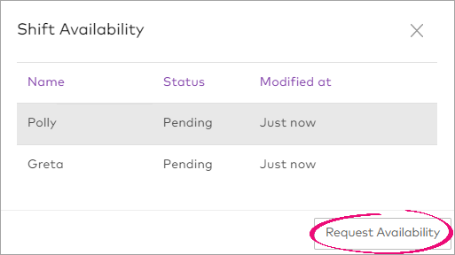 Once your employees have had time to accept or decline the shift, open the Shift Availability panel again to check their responses in the Status column.