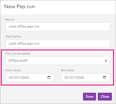 Enter a Name and Description for the pay. If it's a regular pay run, select a Pay run template. The dates will be set automatically based on the last pay for that template, but you can change them if you need to.