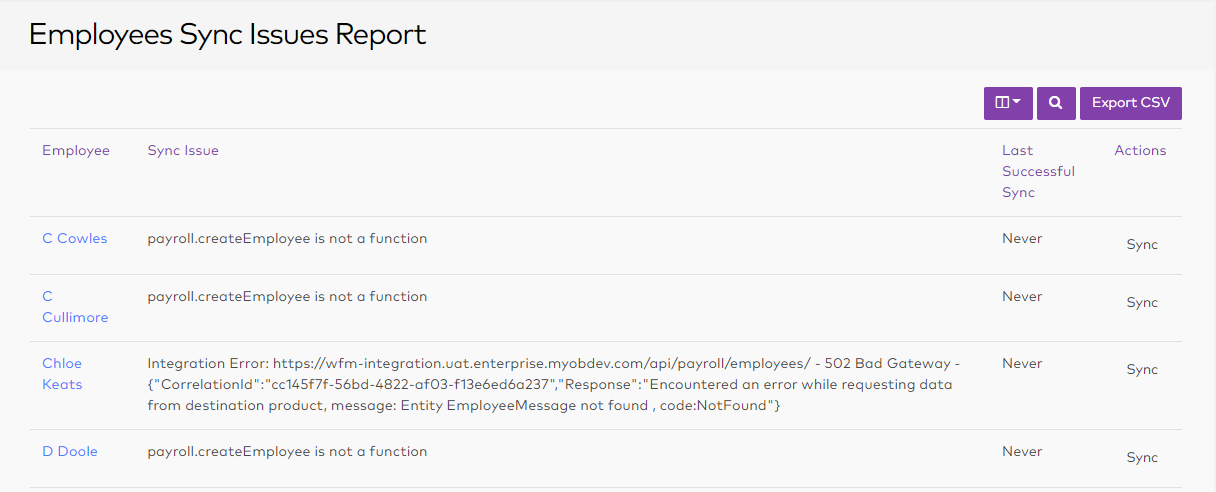 This report displays any issues that occurred when Advanced Workforce Management attempted to send employee information to Advanced Payroll.