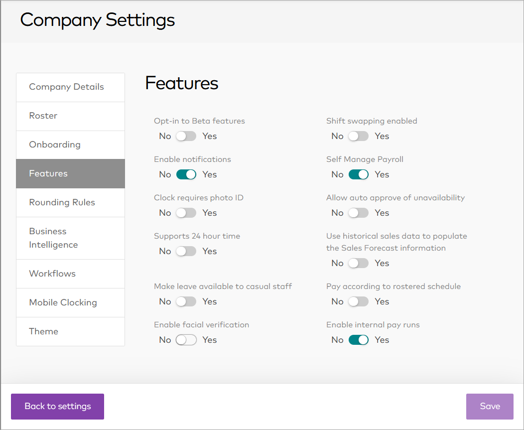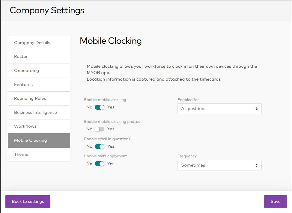 Enable clock in questions | This enables you to ask employees to answer specific questions as they clock in. This can be used in a number of ways, including as a quick health check, or to ensure employees have seen company-wide announcements. These are configured separately, for details Setting up and reporting on clock questions. |