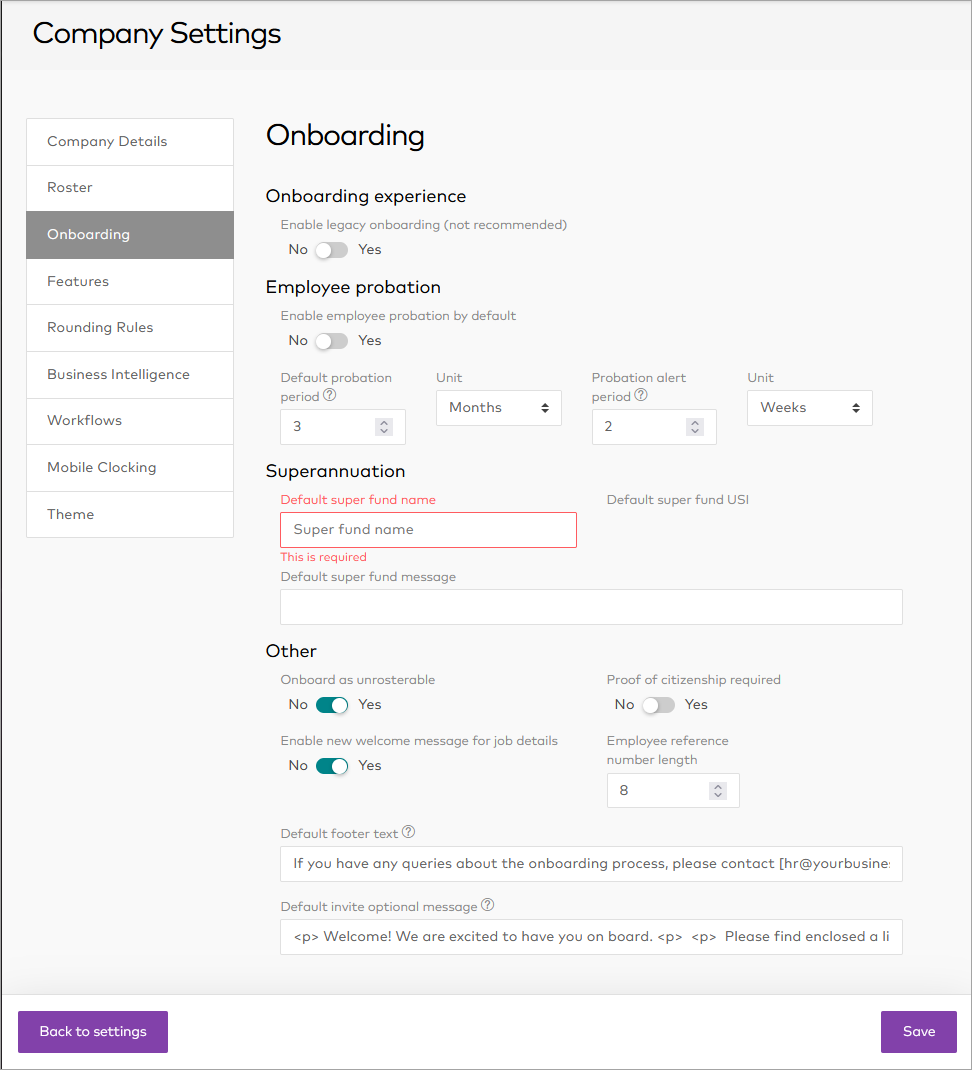Default super fund message (AU only) | This will be displayed in the footer during the onboarding process, advising employees of the default superannuation fund. We recommend something like the below. Our default superannuation fund is Sunsuper. The USI is 98503137921001. |