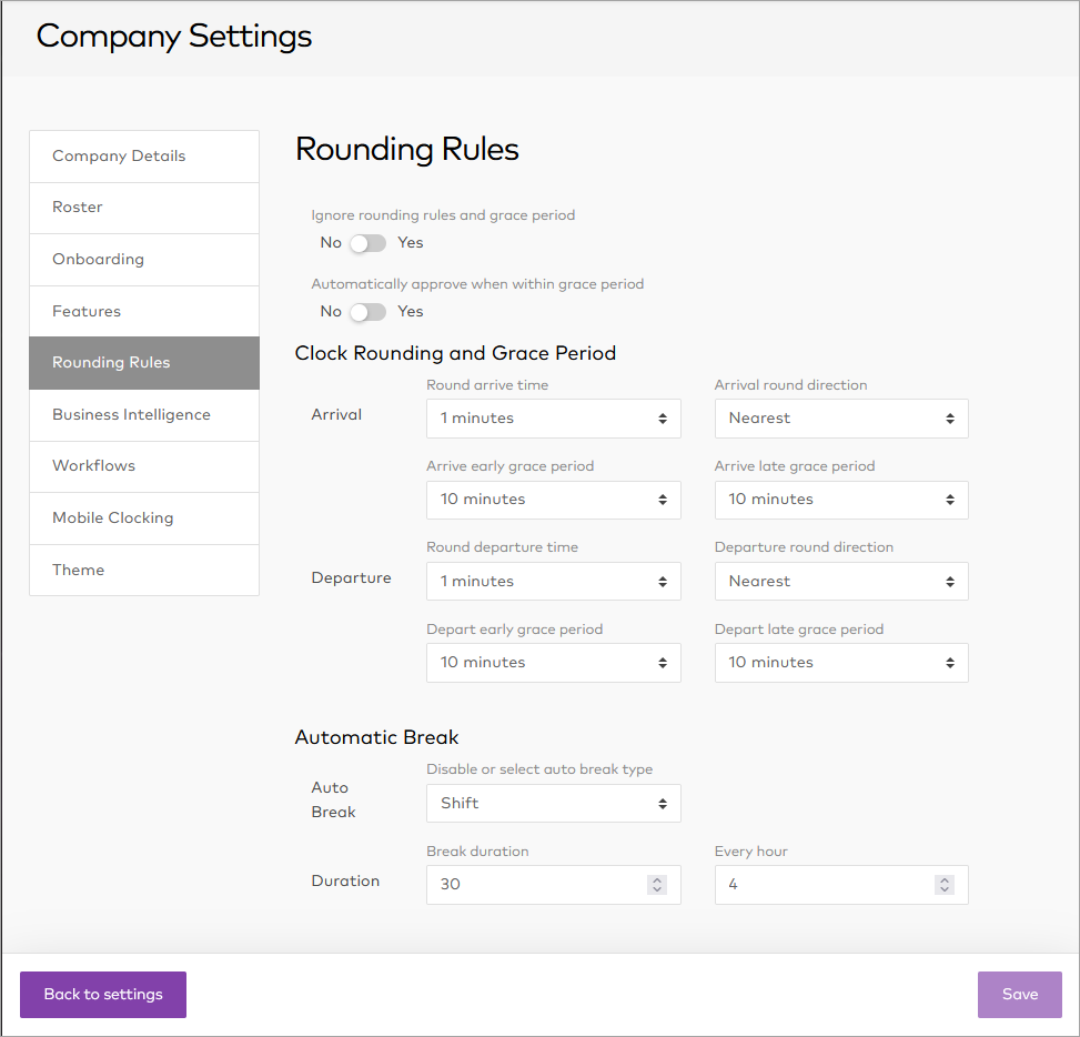 Also see the full articles at Adjusting clock rounding and Adding breaks to shifts and timesheets automatically