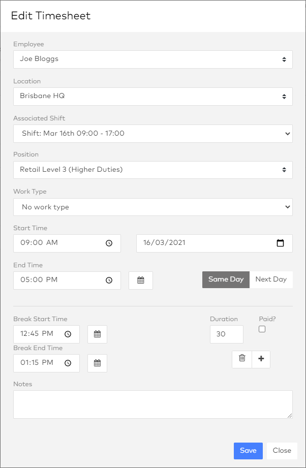 You would need to do this if for example an employee forgets to clock in/out for a scheduled shift and this happened to fall on a Public Holiday which would require a specific Work Type to be added.