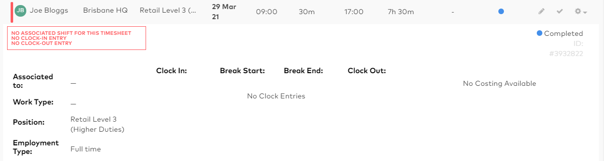 As a manager with access to the Manage Time section , you have the ability to add timesheets for employees. You would need to do this in the case where the employee did not clock in for a shift that they were not rostered for.