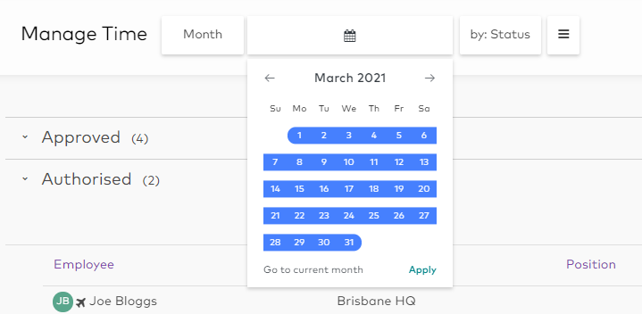 Click on the calendar picker and select the date range you want to view then click Apply. You can also click Go to current day/week/month then click Apply.