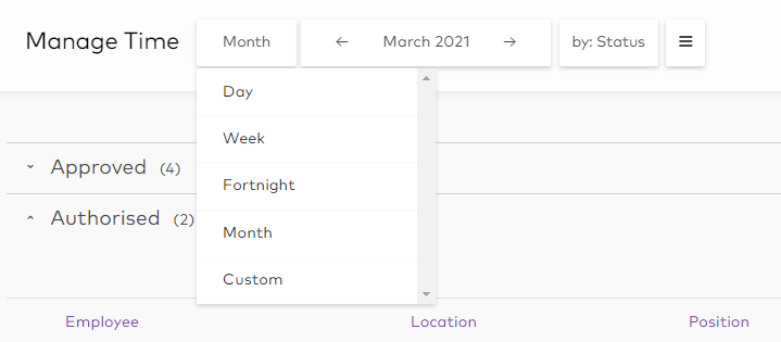 Click on the view filter and pick the time period that suits your needs. You can choose Custom to enter a specific date range if you need to narrow down the timesheets you are viewing.