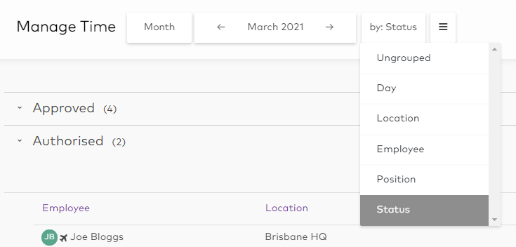 Click the group by: drop down and select Status. This would be the ideal choice if you want to review outstanding timesheets.