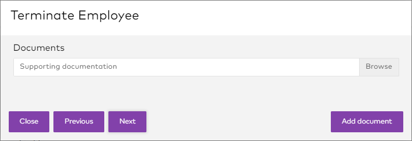 Click Browse to find and upload any supporting documentation, e.g. a letter of resignation. Click Add document to upload additional documents. Once you have added all documents, click Next.