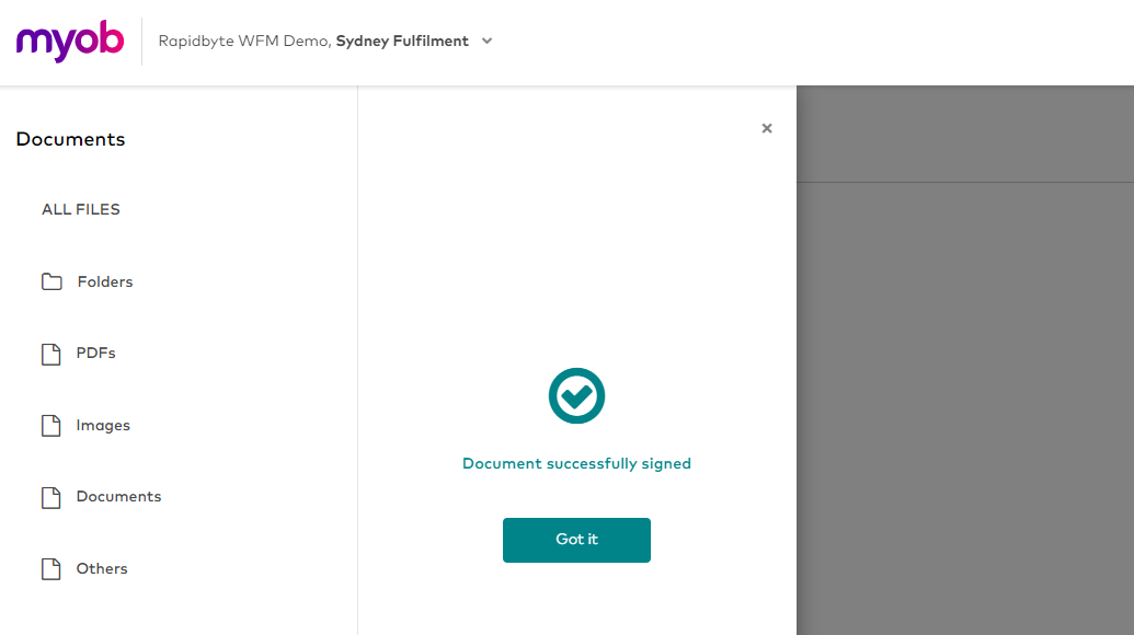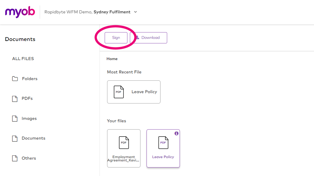 If you have been invited to view and sign a document by your manager, you will receive an email titled "Signed Document Review Requested". You can view and then sign the document from the MYOB Advanced Workforce Management web portal.