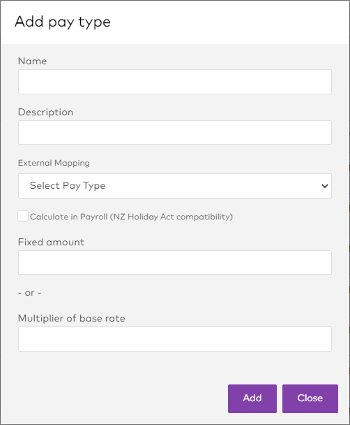Pay types let you set up different items that can be included in employee's pay. Pay types are used to calculate the amount or multiplier to use in roster/timesheet costing.