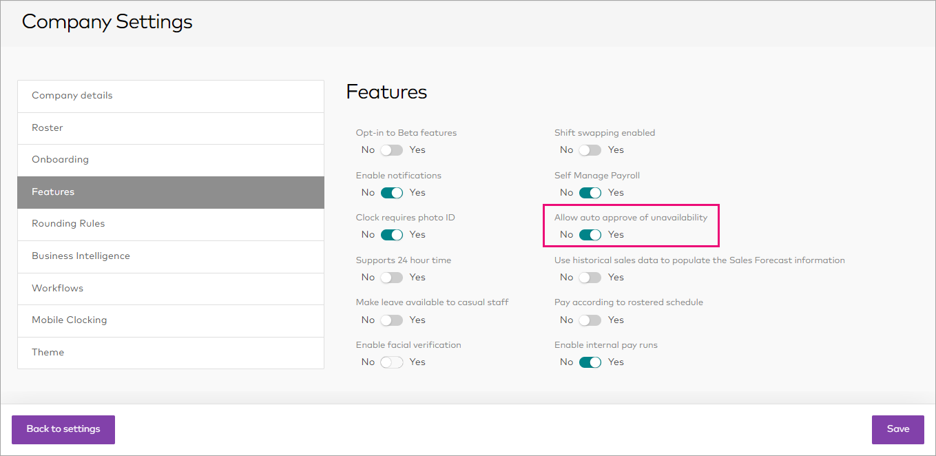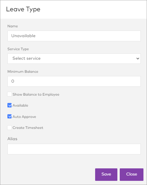 Unavailable is a built-in leave type for casual employees, though you do have the option to make the requests approve automatically. If you would like full- and part-time employees to enter unavailability in the same way, you'll need to create a custom leave type.