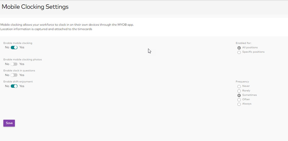 By default Mobile Clocking will be enabled for "Specific Positions", this permission overrides the Location level permission that allows mobile clocking. Make sure either to change this to "All positions" (if everyone should have access to Mobile Clocking) or add the employees permission to the list. (To allow clocking for just some employee types.)
