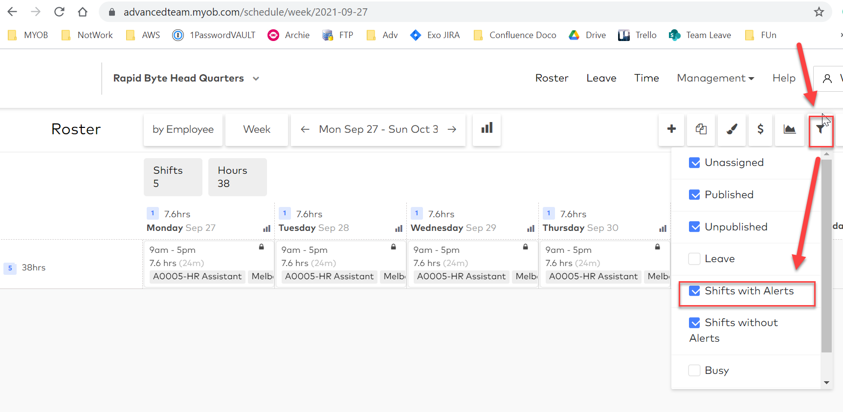 The easiest way to check what alerts apply to your roster is to use the Filter option at the right-hand side of the Roster screen to filter for Shifts with Alerts