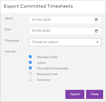 Select your filter options and data fields, then click Export to create a CSV of all committed timesheets in a period, regardless of group. For more information, see Exporting timesheets.