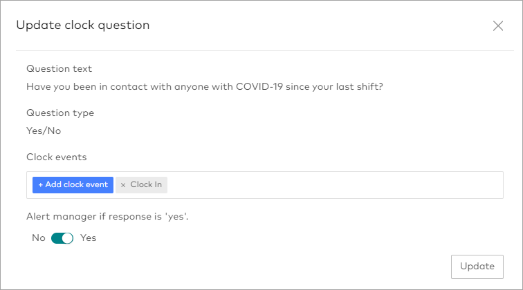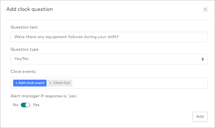 If you only want the event to apply to certain clock events, click Add clock event and select the events it should apply to. By default, clock questions will be asked every time an employee clocks in or out of a shift or break.