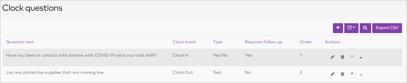 Go to Management > Settings > Clock questions. The list of clock questions appears.