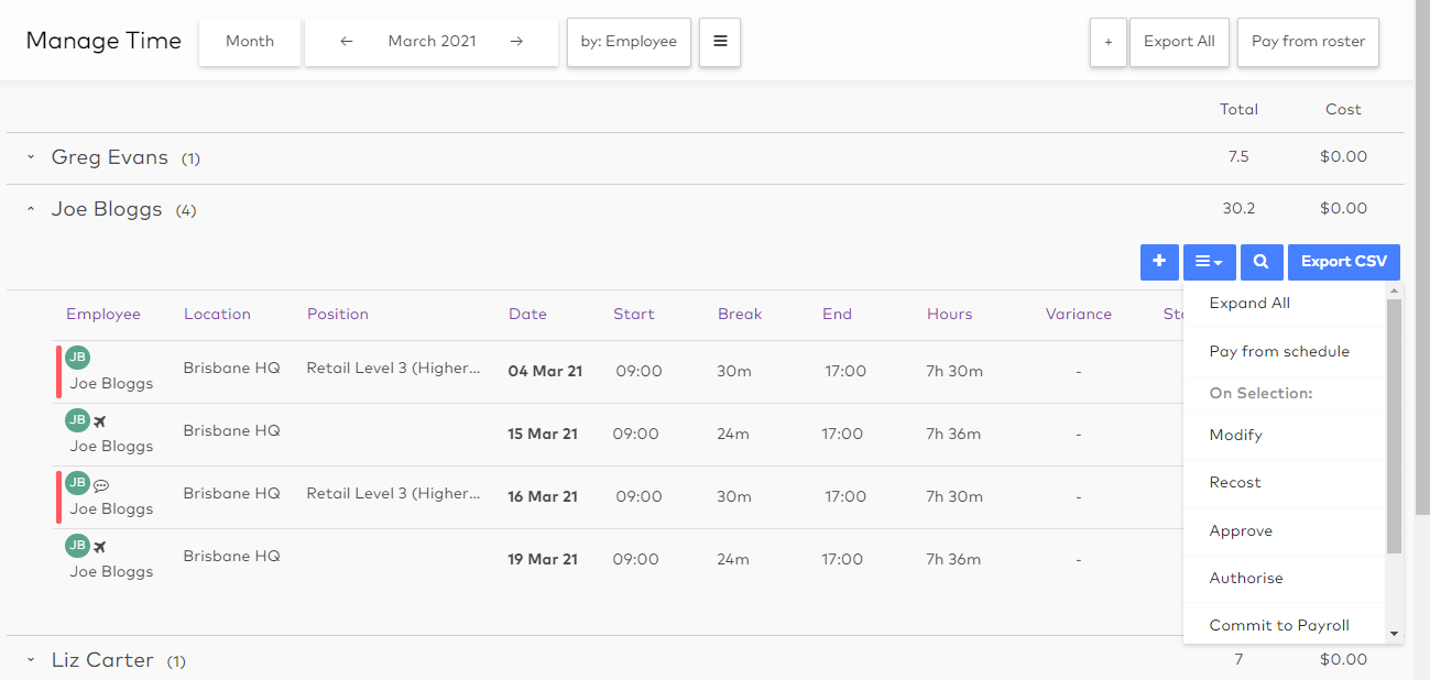 To use the pay from roster function for a single employee, group the Manage Time screen by employee, then select Pay from schedule from an employee's dropdown: