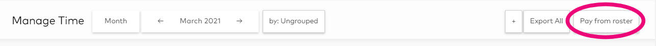 Go to the Manage Time page - a Pay from roster button is available at the top right of the page.
