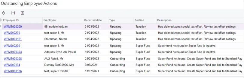 The Outstanding Employee Actions screen in MYOB Acumatica — Payroll (ID: MPAT4002) lists all the changes that need your input and links you straight through to the employee records, so you can complete them quickly and easily.