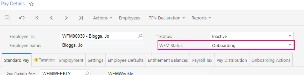 Employees added to MYOB Acumatica — Payroll from MYOB Acumatica — Workforce Management have a WFM Status set to "Onboarding". Once you've made any changes to their record, you need to change them to "Active".
