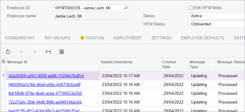 You can use this tab to track or troubleshoot the employee updates from MYOB Acumatica — Workforce Management.