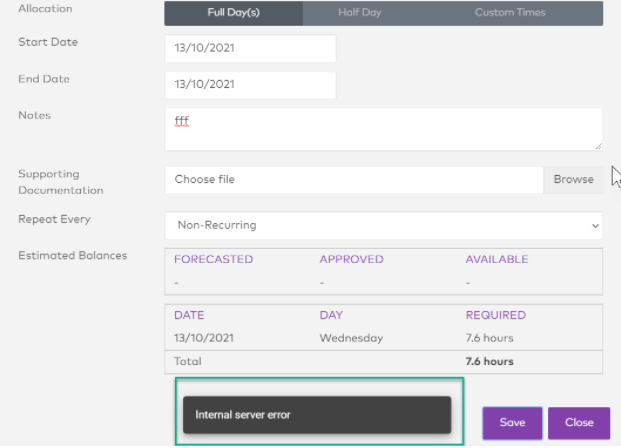 When I apply for leave I get an "Internal Server Error" (Website) or a blank screen (Mobile)