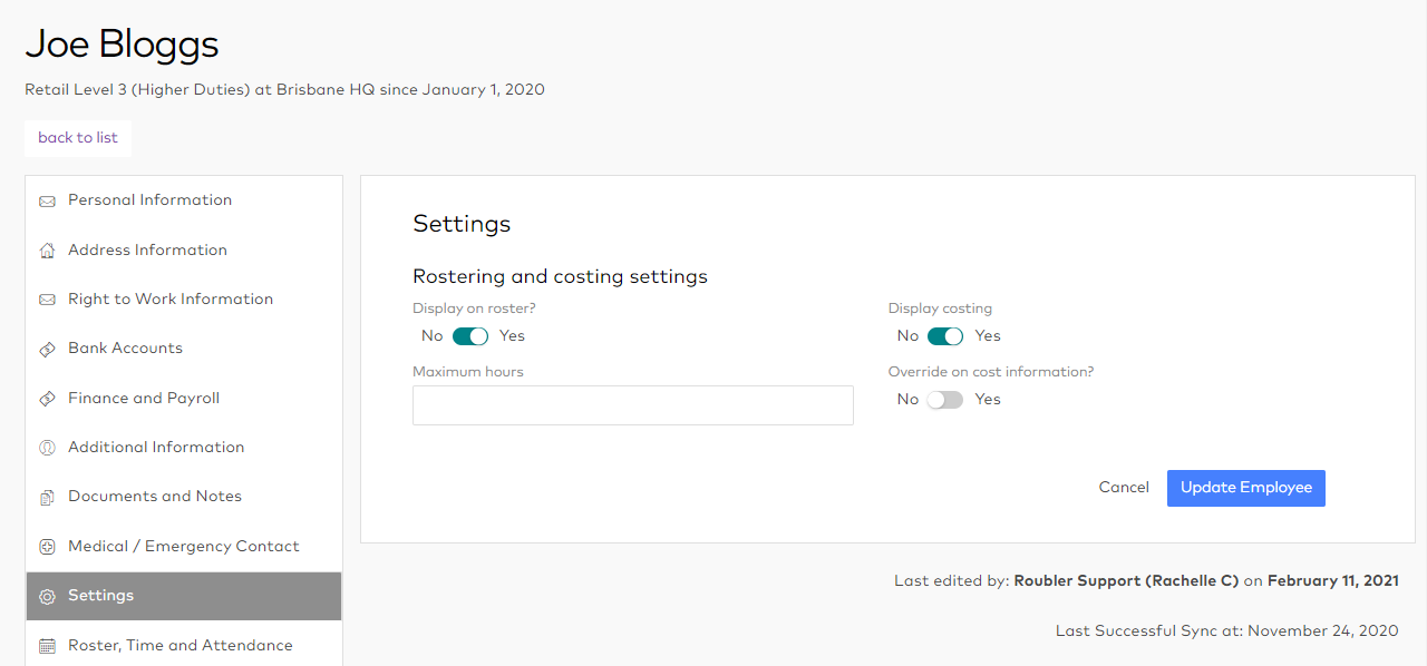 Make sure that the Display costing option is set to Yes if you want to display costs for this employee. If it is not, click Edit, change the option to Yes, then click the Update Employee button.