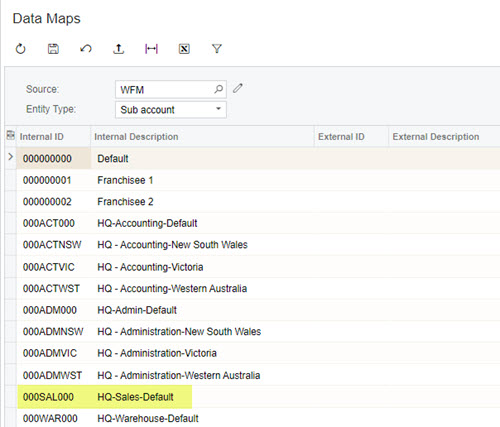 Any sub accounts entered on the Subaccounts screen (GL203000) are automatically populated to the Internal ID and Internal Descriptions fields on the Data Maps screen (MPPP7020). These form the WFM Sub account. Hyphens contained in the sub account codes are stripped out.