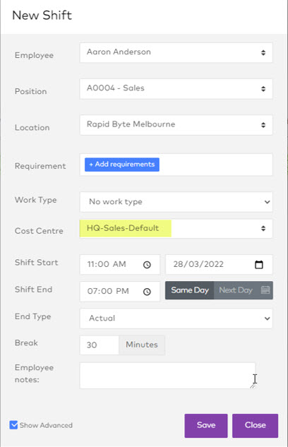 Adding the Cost Centre to a Roster