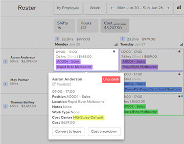 This example follows a roster assigned to Cost Centre ‘HQ Sales Default’ which is mapped to Subaccount 000-SAL-000 in Advanced Payroll.