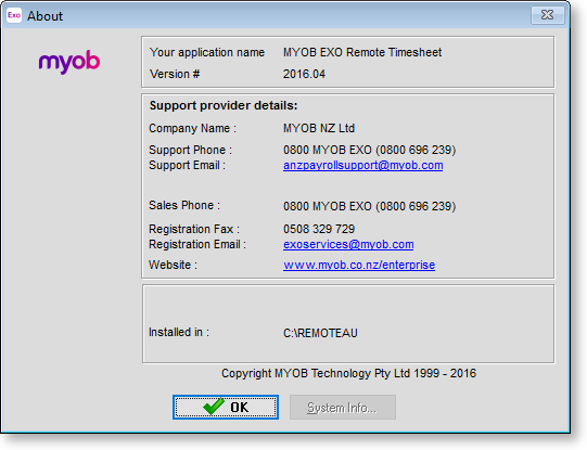 If a Support person or other MYOB representative needs to know the current version number, then check it in this screen - the quickest way to access it is to press F11 on your keyboard (this works from almost anywhere in the software). You can also access it by selecting About from the Help menu.