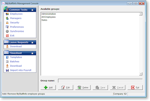 Add Click the Add button to create a new employee group – the cursor will be placed into the Group Name field. Once you have entered the name, click the Save button to confirm your changes.
