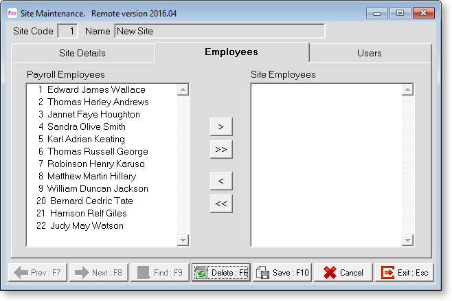 Employees (to add as users) This lists the employees for the site and allows you to add them as users so that they can log in to the Site and enter their timesheets. Double-clicking in the list or clicking the < button will add a single employee. Clicking the << button will add all the employees in the list.