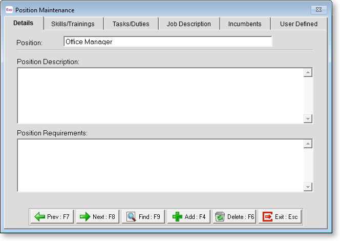 Although it is important that all employees are assigned a position to make the system effective, the degree to which this area is used is completely dependent on your organisation's requirements. For example, some organisations may wish to use this area to a very low level, they may enter quite global options for positions such as Office Worker which would incorporate, receptionists, office Junior, Secretary etc. Other organizations will have more complex requirements for positions where they will use this area to enter more detailed Position Analysis.