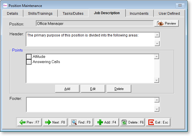 Points This area lists the Details0 assigned to this Job Description. Click the Add button to display a list of available Job Description points to assign.