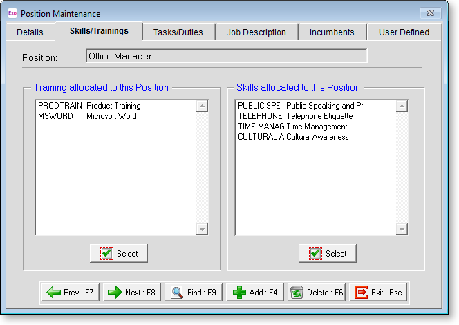 To assign skills and/or training, click on the Select button in the appropriate area, which displays the skills and/or training that you have created. These areas are not compulsory but are recommended to ensure that your system is effective.