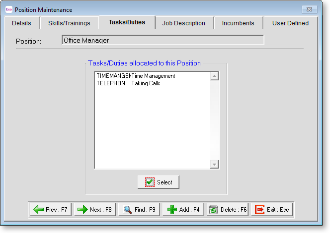 Click the Select button to display the list of tasks and duties you have created and assign them to the position.