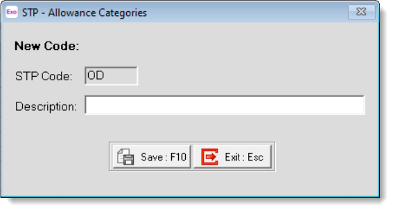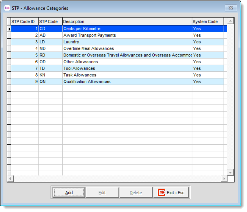 Select Single Touch Payroll > Allowance Categories from the Maintenance menu to open the Allowance Categories window. This window lets you set up categories for Allowances, which are required when submitting payroll details to the ATO (Single Touch Payroll).