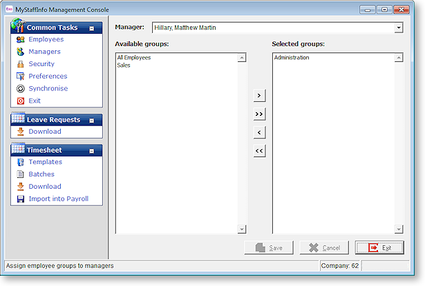 This is the fourth Task in the Managers Group, and is where you match employee groups with managers. A manager may preside over more than one employee group.