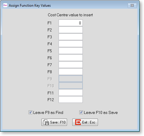 There are twelve functions keys available on the keyboard (F1 to F12), however F9 and F10 are usually used for Find and Save respectively, so we recommend that these are left with their original functions (though they can be changed by removing the tick from the Leave F9 as Find or Leave F10 as Save boxes). Whatever cost centre number is entered into the fields in this screen will be automatically inserted when that function key is pressed during a clocking.