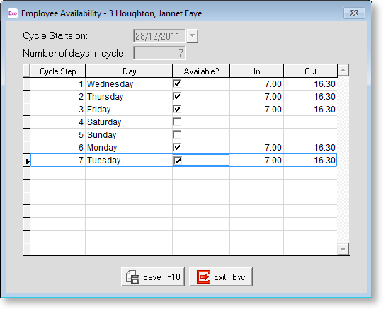This window displays the Roster cycle associated with the employee. To enter availability times for a day, tick the Available box for that day and input In and Out times. If an employee falls outside of an availability rule, you will be alerted of this in the Staff Scheduler.