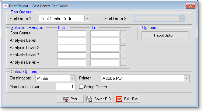There are three options for printing bar codes on the Supervisor menu: Report - Old Barcode Printing uses a simple interface with fewer options; Report - Cost Centre Barcode Printing and Report - Employee Barcode Printing use a different, more complex interface.